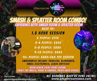 Enjoy a bundled experience of both our Smash and Splatter Rooms while saving money! Enjoy the best of both worlds with this combo experience!